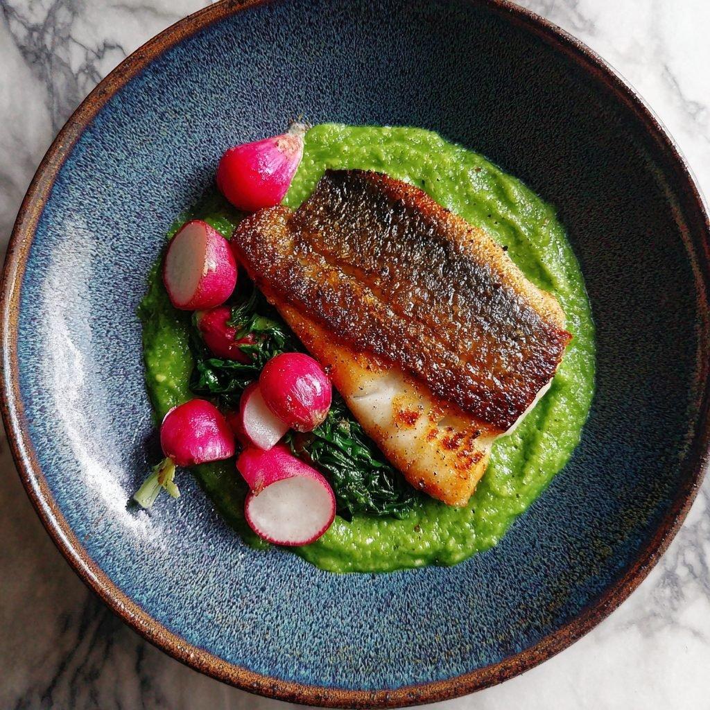 - Equilibrio cromático y sensorial: El verde vibrante del puré de ajo silvestre crea un contraste visual impresionante bajo la piel dorada y crujiente del pescado.