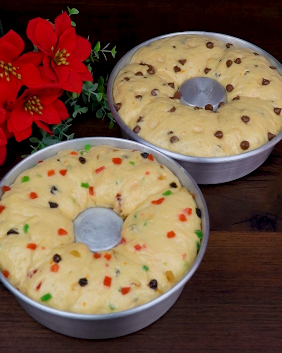 La mistura de frutas confitadas puede variar según sus preferencias personales o disponibilidad. Puede optar por pasas de uva rubias o negras, cáscaras de cítricos confitadas o cerezas. Un pequeño rebozado de harina en los rellenos antes de incorporarlos ayuda a evitar que se hundan hasta el fondo de la masa.