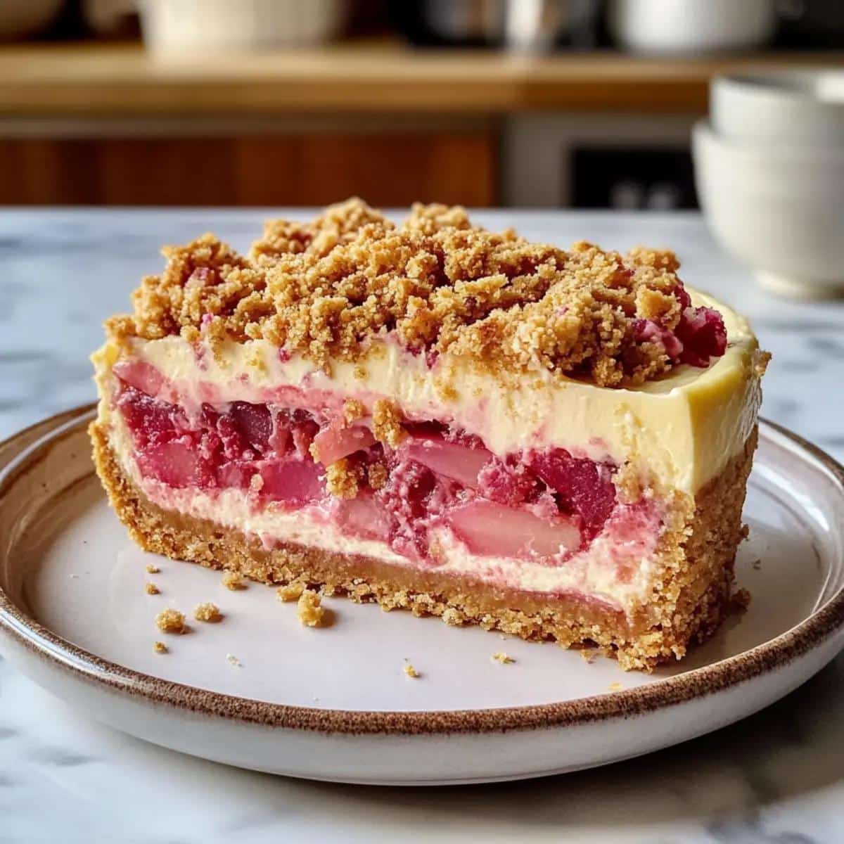 Una tentadora creación que combina una base de galleta mantecosa con una capa de cheesecake cremosa y un toque ácido de ruibarbo, coronada con un crujiente topping de streusel.